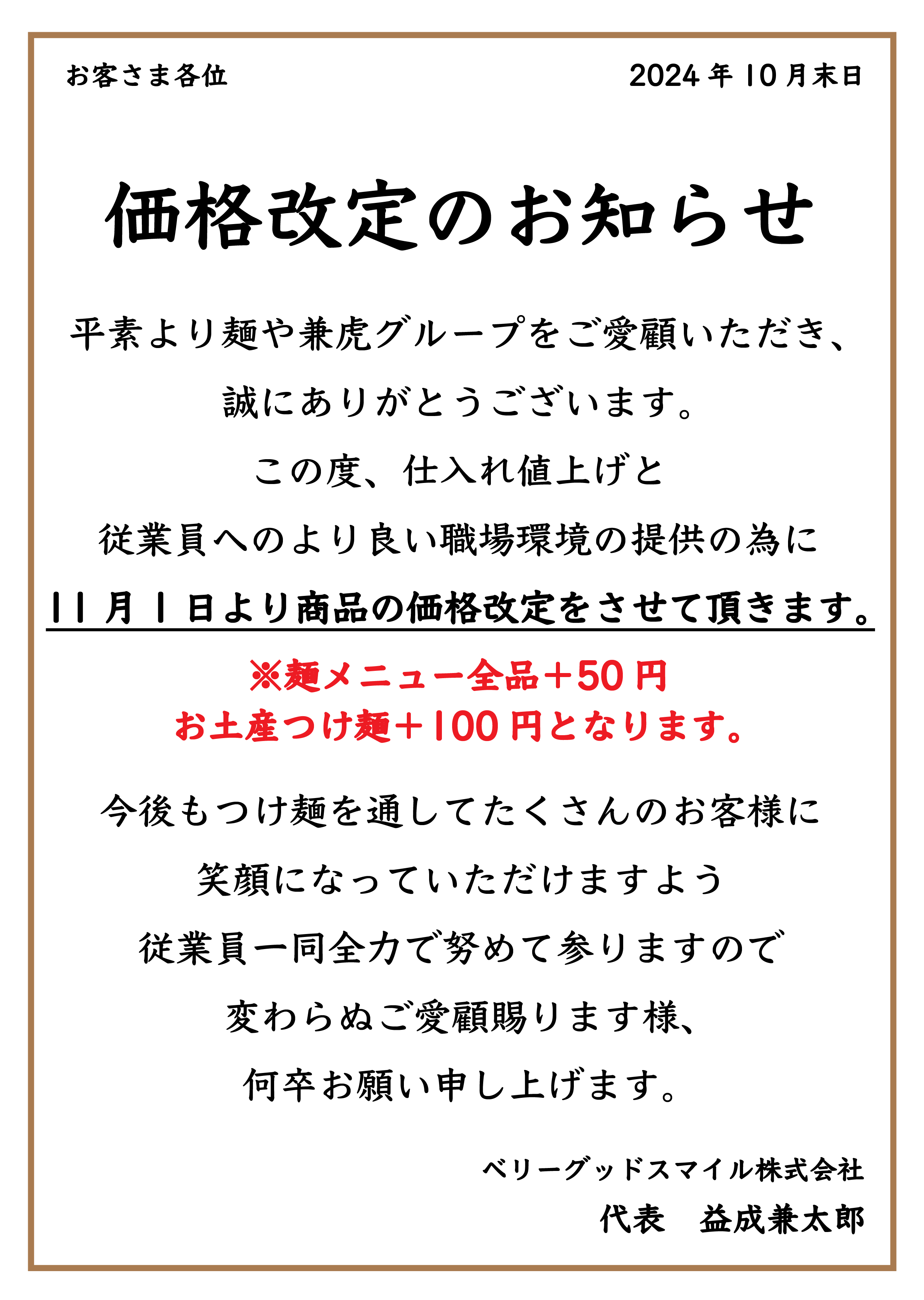 この度、仕入れ値上げと従業員へのより良い職場環境の提供の為に
