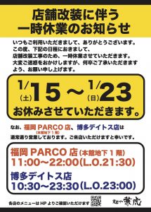 【天神本店 休業期間】1月15日(土)〜1月23日(日)